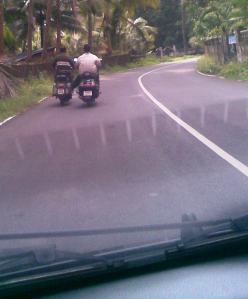There’s a law in India stipulating that when someone drives a scooter or a motorbike on Highway 17 they must wear a safety helmet. Their passenger(s), regardless of how many, need not. In fact the wearing helmets is nothing at all to do with safety.