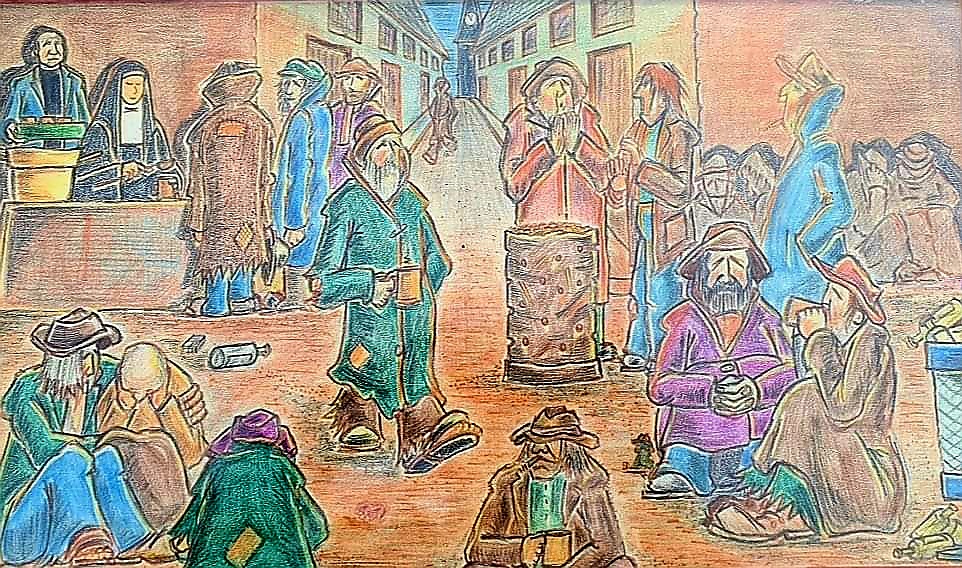 A coloured pencil piece from the 1980s inspired by Ralph McTell’s song which tells the story of the homeless and their daily struggle to survive.