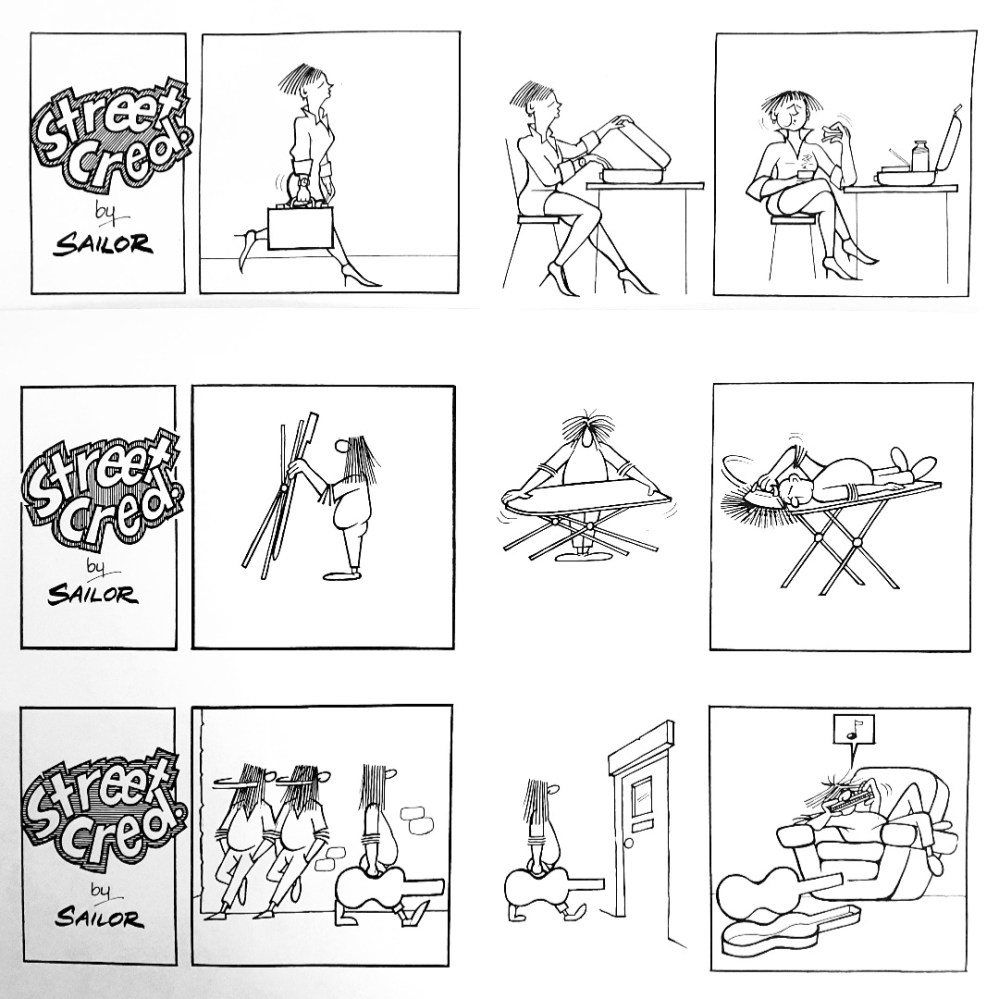 Often over the years I’ve created many cartoon strips, usually for children, but also occasionally for young adults such as this one. The theme of Streed Cred looked at the importance people place on their self image in a variety of life styles, especially how they are seen by their peers. As an artist I wanted to convey this funny side of life purely through drawings and with no dialogue or captions.