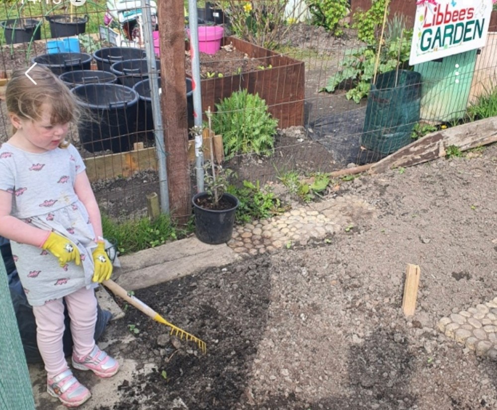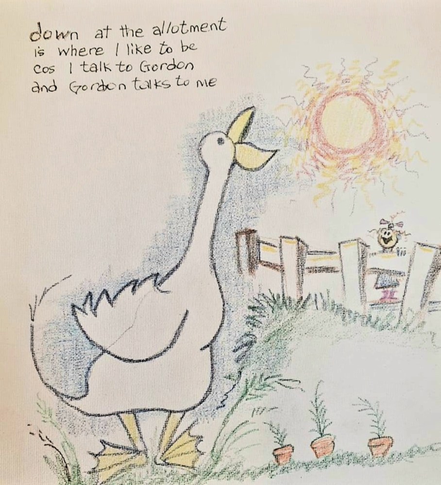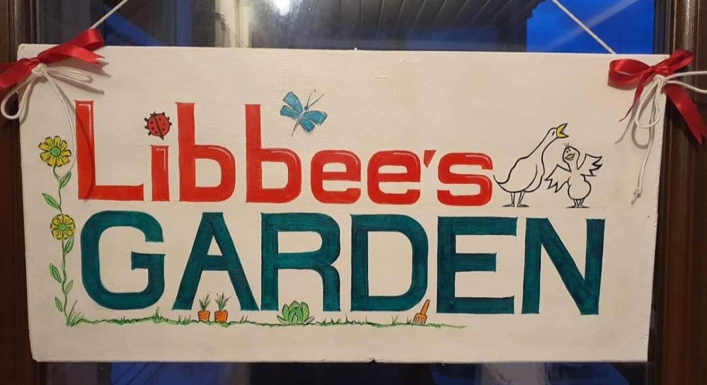 Little signboard for Libbee’s Garden in a corner of the allotment where she grows strawberries and talks to Gordon the Goose in the next plot.