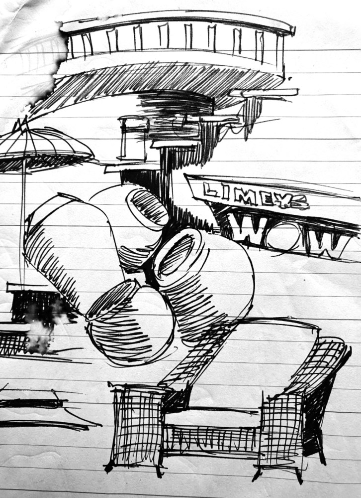 Another damaged ink sketch from 2007-9 when I lived in India. As well as working as a musician we ran a beachside restaurant called ‘Limeys at WOW’ in Velsau, Goa, employing 12 staff and serving a full menu of Indian, Chinese and English cuisine. The sketch is rescued in order that I can create a painting for that chapter of my life.