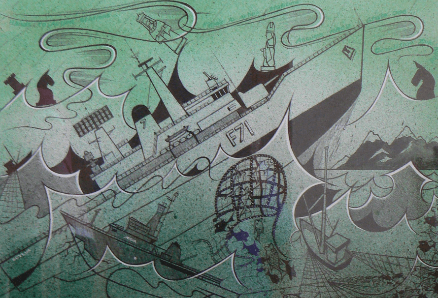 HMS Scylla protecting the British fishing fleet. This painting shows the Icelandic Gunboat Aegir ramming the ship. Though damaged we completed the tour. on quiet days as crew we played chess and had a beard growing competition.