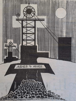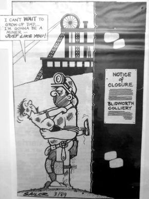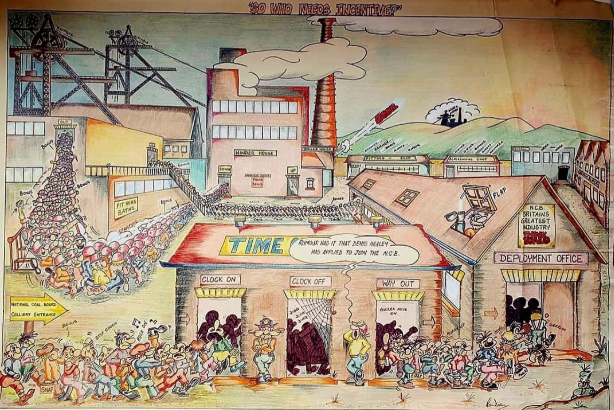 Drawing ‘Who needs incentive’ submitted to the National Mineworkers Art Exhibition 1978 at Olympia, Blackpool. The painting took First Prize in Class 3 which came with a £60 prize. When offered a further £60 for the painting I refused to sell it because I hated the job so much that I didn’t want it on display. When reurned to me it was unframed, rolled up and placed in a cardboard tube where it has remained ever since.